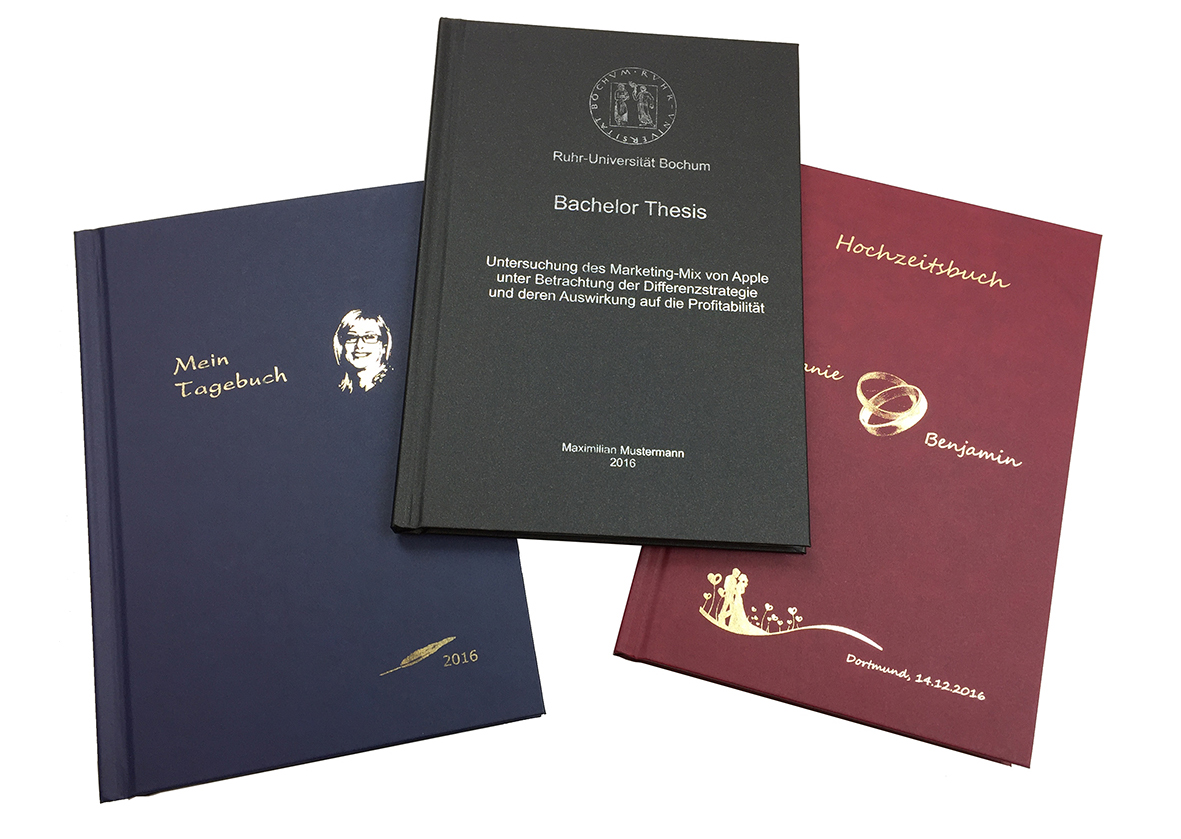 Die Hardcover-Bindung gehört zu den hochwertigsten Bindungen die es gibt. Sie besteht aus einem sehr stabilen Hardcover mit einer glatten Oberfläche in den Einbandfarben Schwarz, Dunkelblau, Bordeaux, Dunkelgrün, Quarz, Silber und Azur. Diese Bindung wird besonders gern für Abschlussarbeiten wie Bachelor-, Master-, Diplomarbeiten oder Dissertationen mit bis zu einer Höhe von 3,4 cm bzw. 280 Blatt in 100 g/m² verwendet. Auch für Hochzeitsbücher, Fotobücher und Rezeptbücher wird diese Art von Bindung sehr gerne genommen. Mit einem speziellen Printer können die Bücher toll beschriftet werden. Es stehen Ihnen die Farben Silber, Gold, Blau und Rot zum Beschriften zur Verfügung.