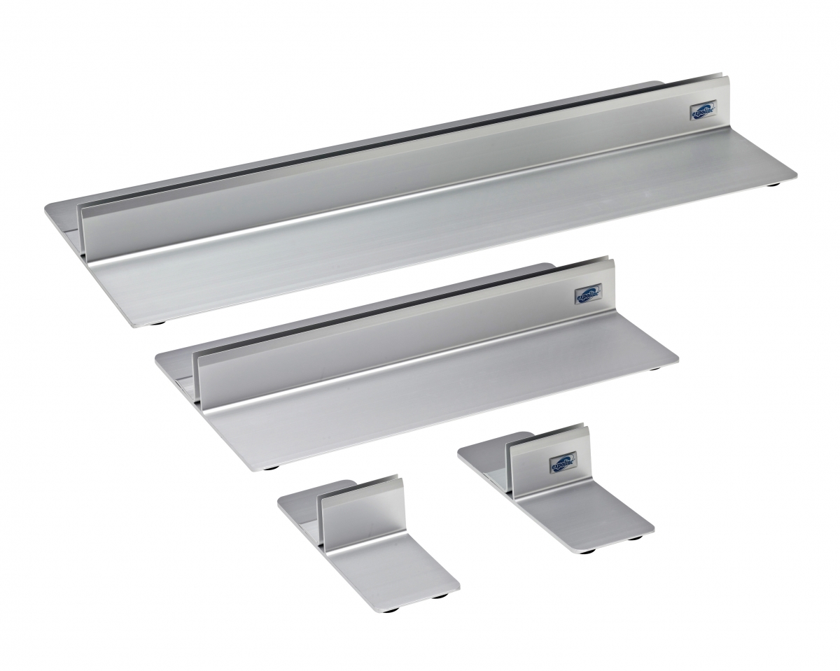 Ein doppelseitiges Bodenaufsteller-System, das alle starren Platten mit einer Stärke bis zu 19 mm fixiert.